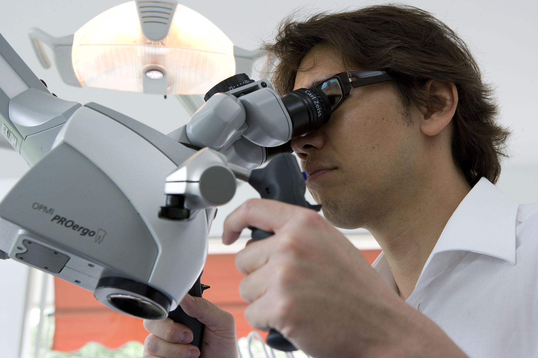 Um die Krankheit zu stoppen, führen wir eine Wurzelkanalbehandlung des erkrankten Zahnes durch. Dabei arbeiten wir mit einem modernen Operationsmikroskop, das jedes kleinste Detail um ein Vielfaches vergrößert. Zunächst muss der abgestorbene Zahnnerv komplett entfernt werden. Anschließend wird der Wurzelkanal erweitert und gereinigt und schließlich mit einer speziellen Füllung verschlossen. Um den Zahn zu schützen und seine Funktion wieder herzustellen, restaurieren wir zum Abschluss noch den behandelten Zahn. So kann der Zahn noch viele Jahre erhalten werden.