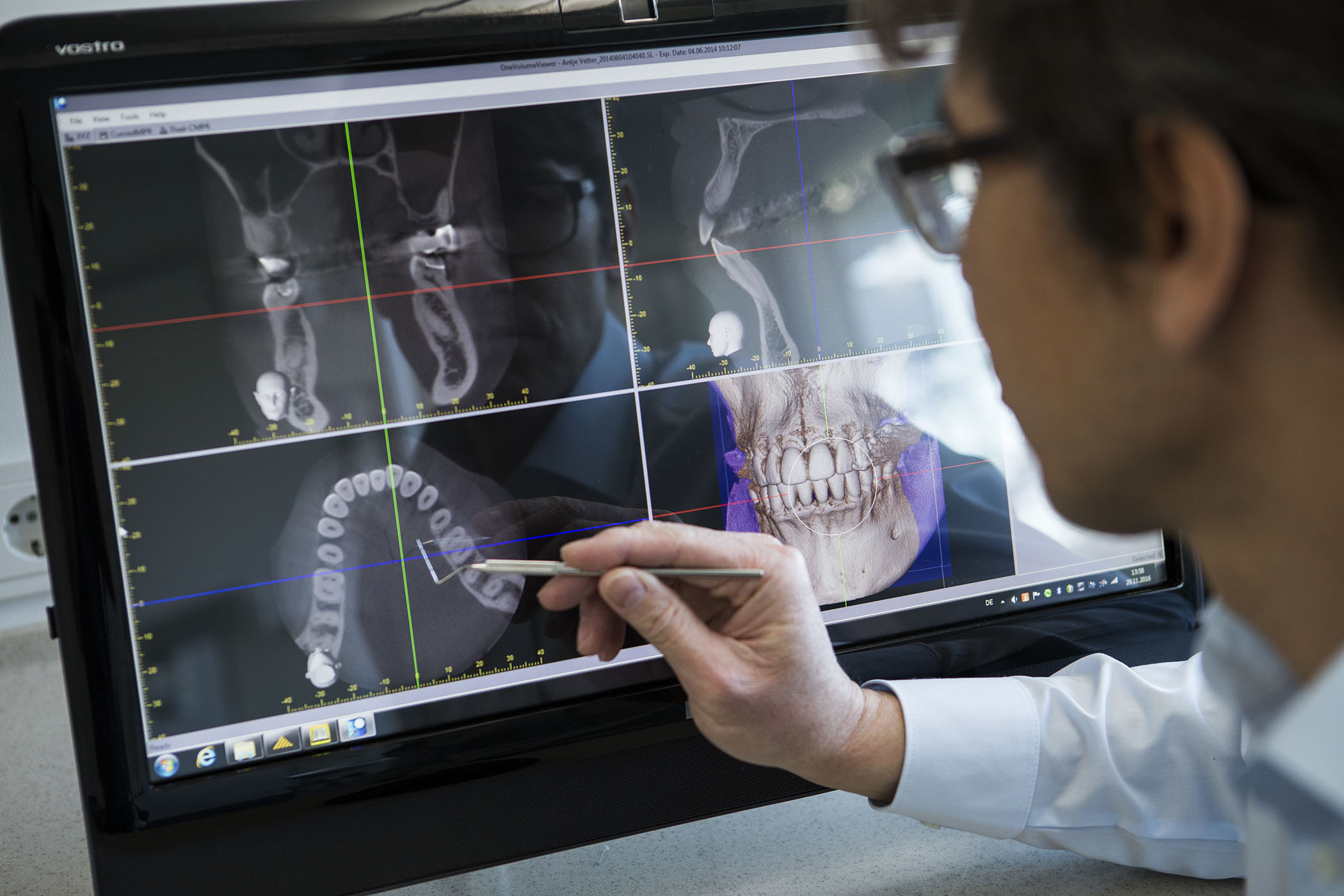 Um die Implantate millimetergenau im Kiefer platzieren zu können, verwenden wir eine computergestützte Führungsschablone. Diese wird zuvor im Labor auf Grundlage der individuellen Kieferanatomie und mit Hilfe eines dreidimensionalen Röntgenbildes (DVT- Digitaler Volumentomograph) hergestellt.